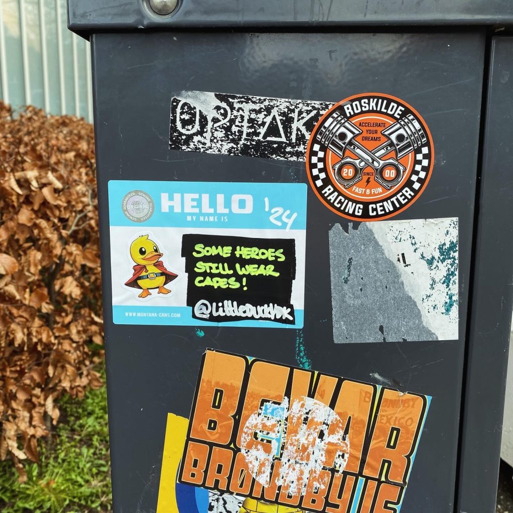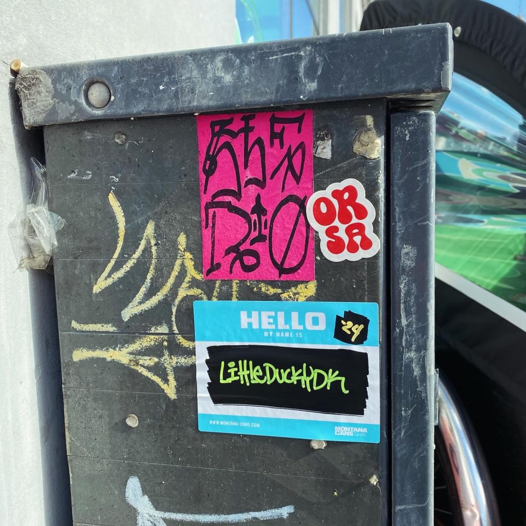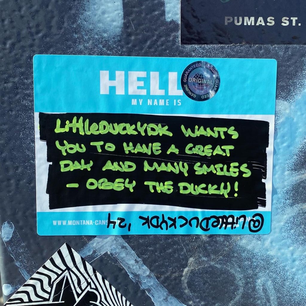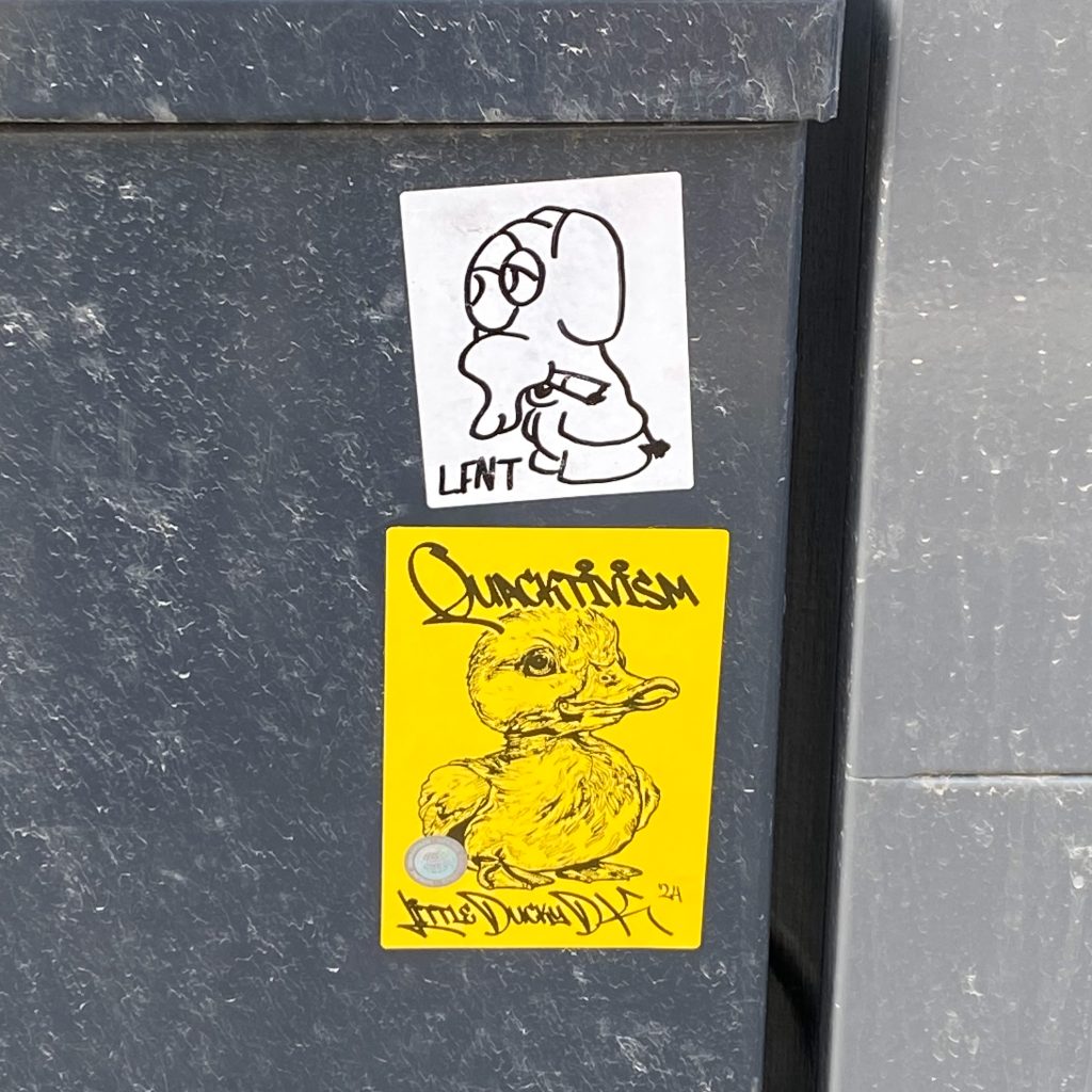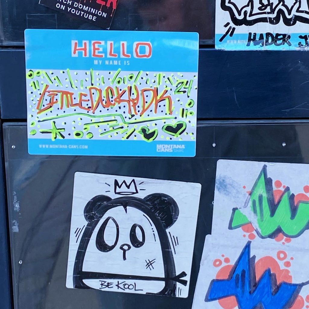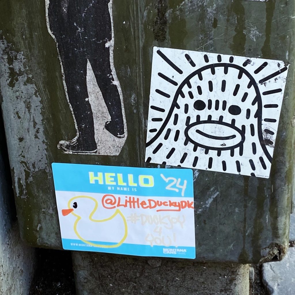 Slapping up stickers is a common practice amongst Street Artists, and is a way to get your “tag” out there, as well as letting fellow “enthusiasts” know you were here. That being said, there is even a practice of trading and collaborating on creation of stickers and their deployment in the world.