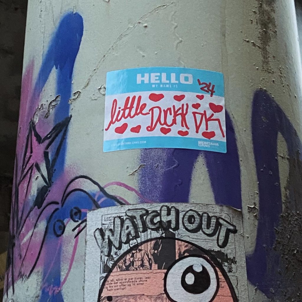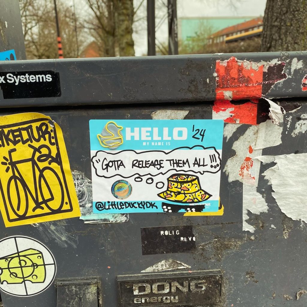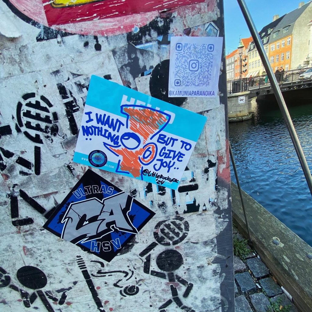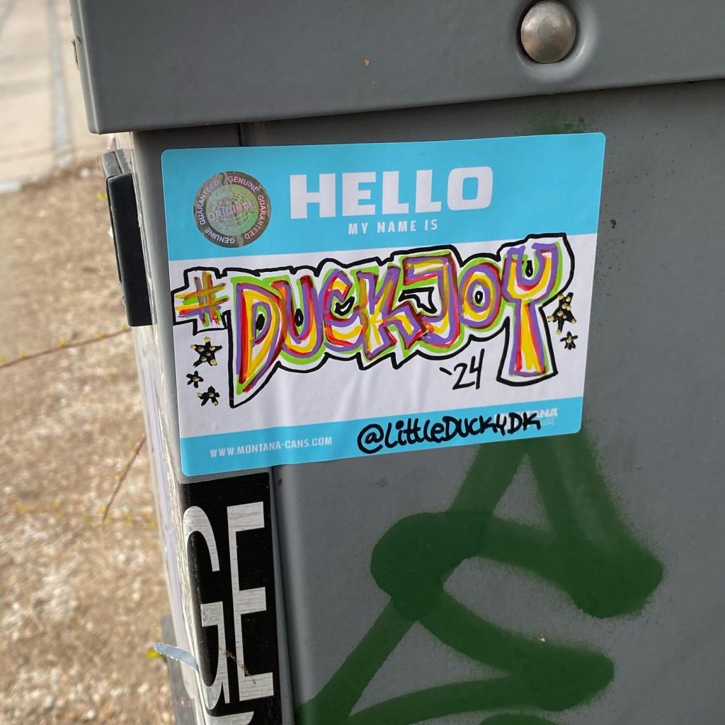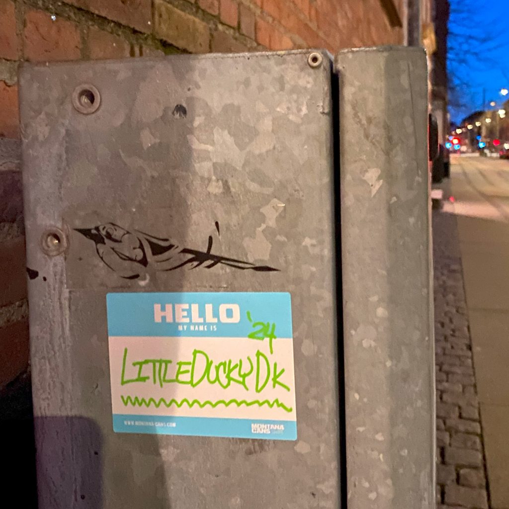 Slapping up stickers is a common practice amongst Street Artists, and is a way to get your “tag” out there, as well as letting fellow “enthusiasts” know you were here. That being said, there is even a practice of trading and collaborating on creation of stickers and their deployment in the world.
